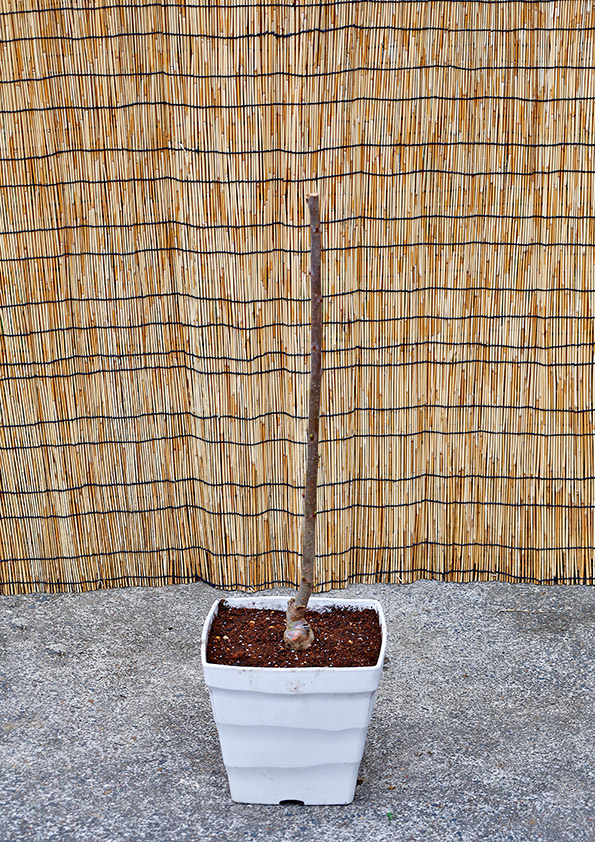 鉢植えでの栽培なので、樹高を低めに育てていくために、樹形は主幹から伸びる主枝を2本残してYの字の形になるように、選んだ2本の主枝以外はすべて付け根で切り落として樹形を管理していきます。
